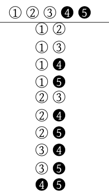 Let us derive the hypergeometric PMF using an example. Suppose we have $N=5$ balls out of which $M=3$ are white, the remaining $N-M=5-3=2$ being black. We pick $n=2$ balls at random. We want to find out the probability that exactly $x=1$ of these two picked balls is white. First, there are ${5\choose 2} = 10$ ways to pick 2 balls out of 5. These are: