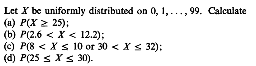 EXERCISE 1:  $X$ follows DUnif$\{1,2,3,4,5\}$ distribution. Find the following probabilities.