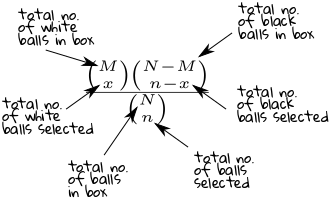 PMF: $$ P(X=x)=\left\{\begin{array}{ll} \frac{{M\choose x} {N-M\choose n-x}}{{N\choose n}}&\text{if }x=0,...,n\\ 0 &\text{otherwise.} \end{array}\right. $$