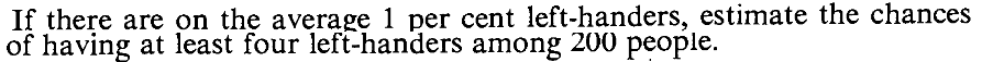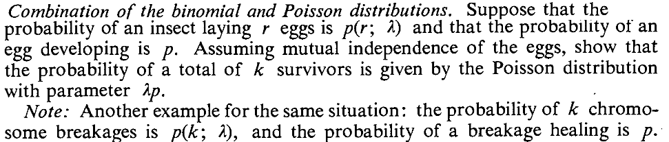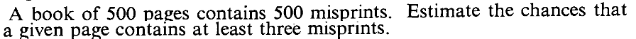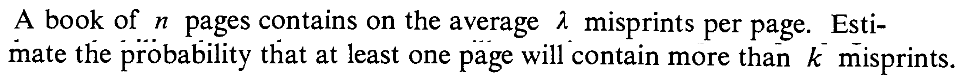 SOLUTION: Here $n=1000$ and $\lambda = 0.01.$ So we should take $\lambda = 1000\times 0.01 = 10.$ By Poisson approximation, $X$ is approximately a Poi(10) random variable. Hence $$ P(X=5)\approx e^{-10}10^{5}/5! = 0.03783. $$ It is instructive to compare this with the exact value, which is $$ P(X=5) = {1000\choose 5} (0.01)^5(1-0.01)^{1000-5} = 0.03745. $$ ■EXERCISE 13: A box has 100 items, each of which either passes a quality control test (OK) or fails the test (BAD). If a box has more than 3 BAD items, then the box is rejected by the quality control inspector. It is known that each item is OK with probability 0.01, and that the items are independent. Use Poisson approximation to compute the probability that a box is not rejected.