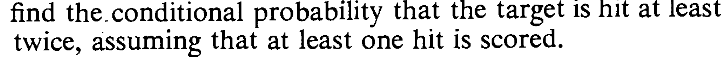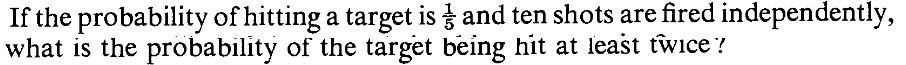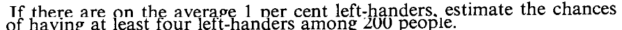 $1-\frac{8}{3e}$ Expectation and variance: If $X$ has Poi$(\lambda)$ distribution then $$\begin{eqnarray*} E(X)&=&\lambda\\ Var(X)& =& \lambda. \end{eqnarray*}$$ $$\begin{eqnarray*} E(X) &=& \sum_{x=0}^\infty xP(X=x)\\ &=& \sum_{x=0}^\infty x\frac{e^{-\lambda}\lambda^x}{x!}\\ \end{eqnarray*}$$ The term for `$x=0$' is zero in this sum. So we can drop it to get $$\begin{eqnarray*} \sum_{x=0}^\infty x\frac{e^{-\lambda}\lambda^x}{x!} &=& \sum_{x=1}^\infty x\frac{e^{-\lambda}\lambda^x}{x!}\\ &=& e^{-\lambda}\sum_{x=1}^\infty x\frac{\lambda^x}{x!}\\ &=& e^{-\lambda}\sum_{x=1}^\infty \frac{\lambda^x}{(x-1)!}\\ \end{eqnarray*}$$ Now put $y=x-1.$ $$\begin{eqnarray*} e^{-\lambda}\sum_{x=1}^\infty \frac{\lambda^x}{(x-1)!} &=& e^{-\lambda}\sum_{y=0}^\infty \frac{\lambda^{y+1}}{y!}\\ &=& e^{-\lambda}\lambda\sum_{y=0}^\infty \frac{\lambda^{y}}{y!}\\ &=& e^{-\lambda}\lambda e^\lambda\\ &=& \lambda. \end{eqnarray*}$$ $$\begin{eqnarray*} E(X(X-1))&=& \sum_{x=0}^\infty x(x-1)P(X=x)\\ &=& \sum_{x=0}^\infty x(x-1)\frac{e^{-\lambda}\lambda^x}{x!}\\ \end{eqnarray*}$$ Drop the first two terms (which are both zeroes) to obtain $$\begin{eqnarray*} \sum_{x=0}^\infty x(x-1)\frac{e^{-\lambda}\lambda^x}{x!} &=& \sum_{x=2}^\infty x(x-1)\frac{e^{-\lambda}\lambda^x}{x!}\\ &=& e^{-\lambda}\sum_{x=2}^\infty x(x-1)\frac{\lambda^x}{x!}\\ &=& e^{-\lambda}\sum_{x=2}^\infty \frac{\lambda^x}{(x-2)!}\\ \end{eqnarray*}$$ Substitute $y=x-2$ to see that $$\begin{eqnarray*} e^{-\lambda}\sum_{x=2}^\infty \frac{\lambda^x}{(x-2)!} &=& e^{-\lambda}\sum_{y=0}^\infty \frac{\lambda^{y+2}}{y!}\\ &=& e^{-\lambda}\lambda^2\sum_{y=0}^\infty \frac{\lambda^{y}}{y!}\\ &=& e^{-\lambda}\lambda^2 e^\lambda\\ &=& \lambda^2.\\ \end{eqnarray*}$$ $$\begin{eqnarray*} E(X^2) &=& E(X(X-1)+E(X)\\ &=& \lambda^2 +\lambda. \end{eqnarray*}$$ $$\begin{eqnarray*} Var(X) &=& E(X^2) - (E(X))^2\\ &=& \lambda^2 +\lambda - \lambda^2\\ &=& \lambda. \end{eqnarray*}$$EXERCISE 14: Find the expected values of the following random variables.