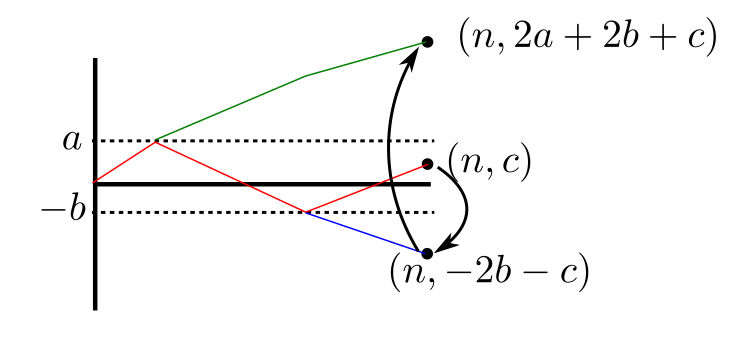 #{paths from $(0,0)$ to $(n,a)$ that are always $>-b$}