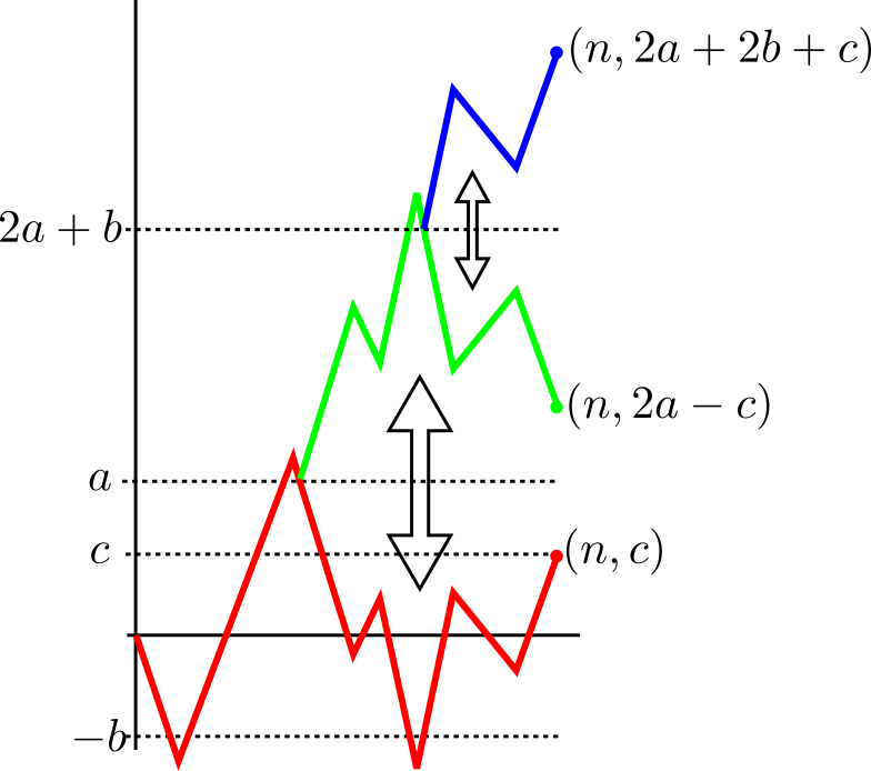 $N_{n,2a-c}-N_{n,2a+2b+c}.$ (Note that the path may touch