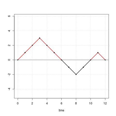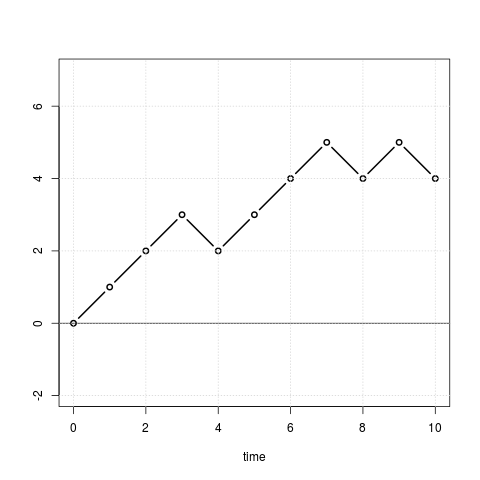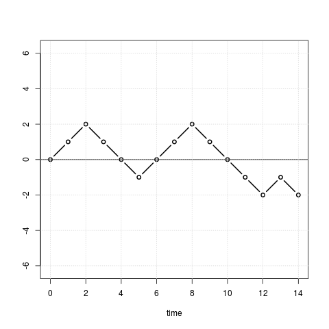 plot(cumsum(x),ylab='random walk', xlab='time', ty='l',asp=1)