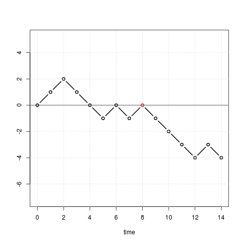 Let $B = $set of paths that never return to 0 at or before time 8.